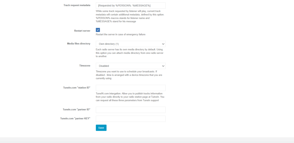 - API Credentials: Set up integration with third-party services like TuneIn Radio API credentials to list your stream in directories.