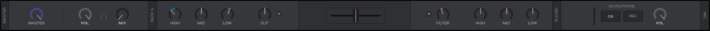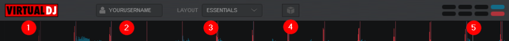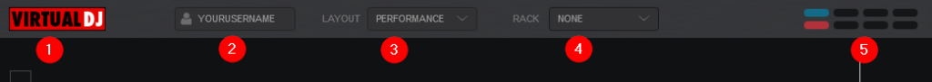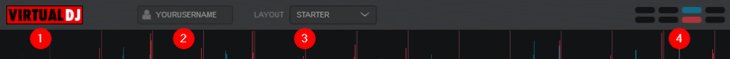 At the very top of the software interface a menu is displayed which provides valuable information about the different aspects of VirtualDJ as well as controls to customize the layout and look. These items change depending on the Layout that you decide to use.