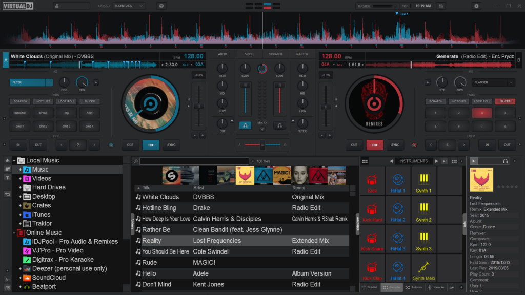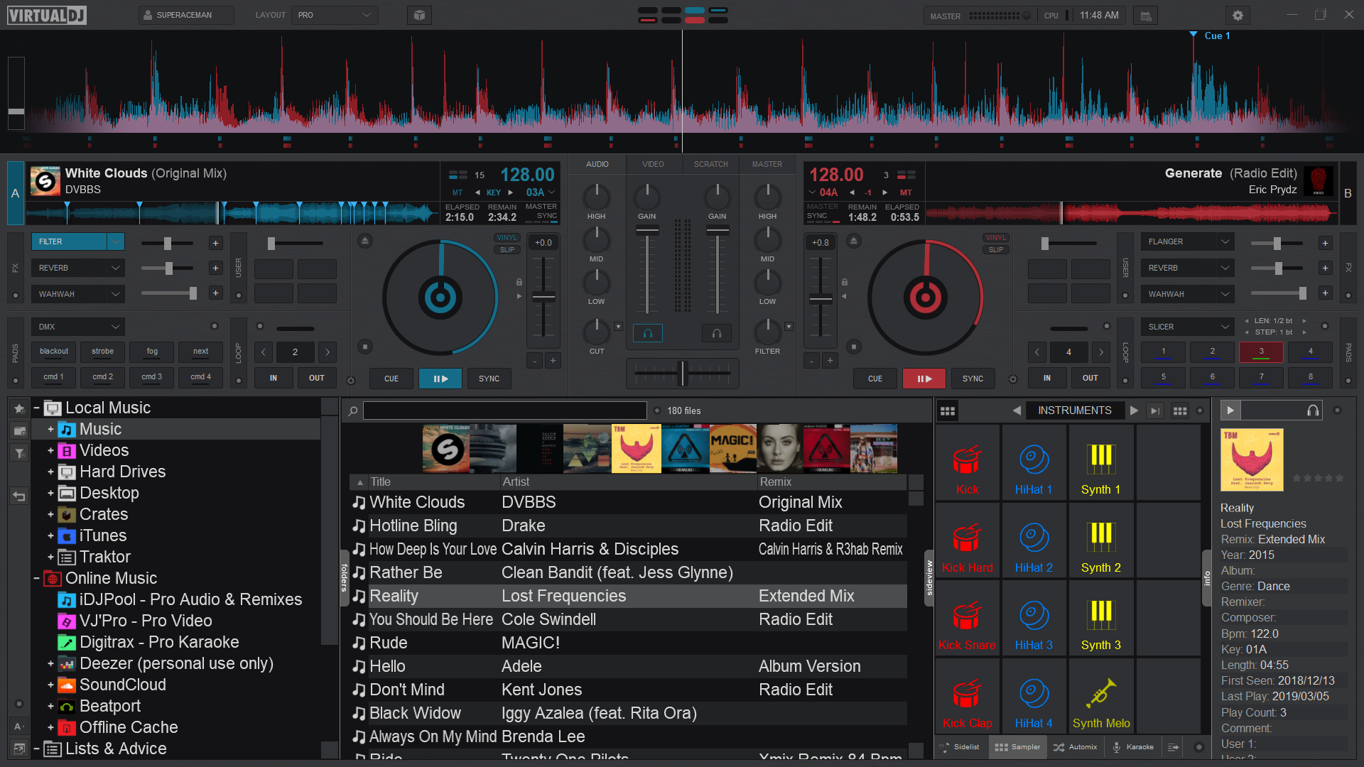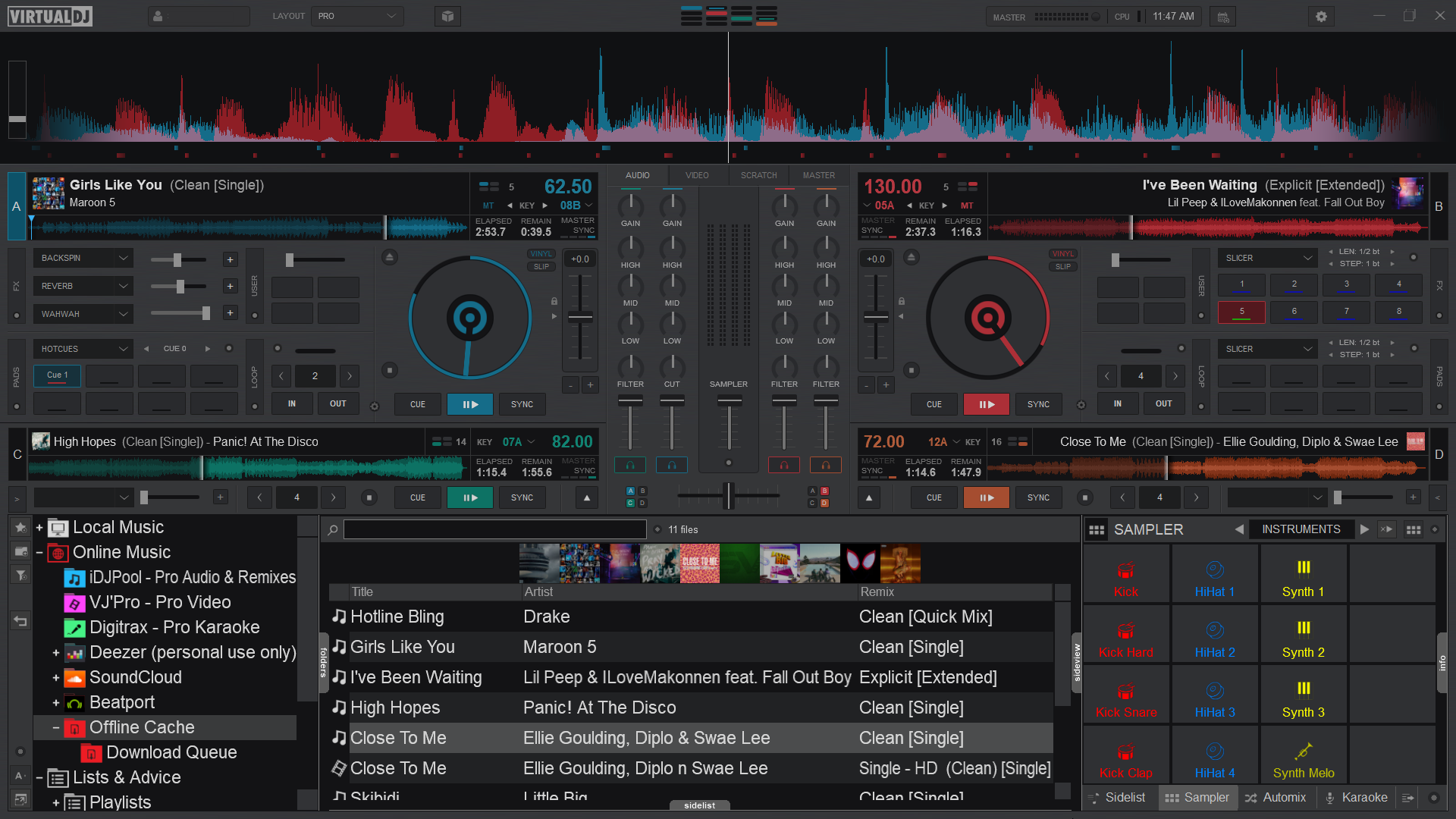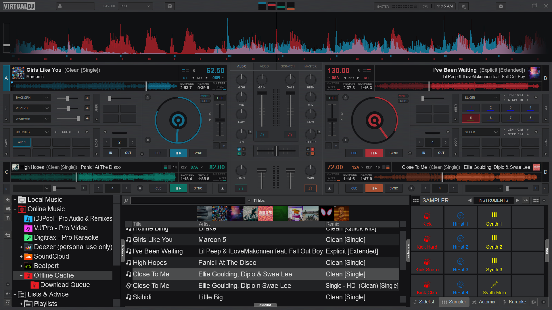Once selected additional display options are available. The default display is 4-Deck with a 2+2 Channel Mixer but can be changed to a full 4-Channel Mixer.
