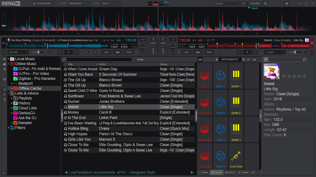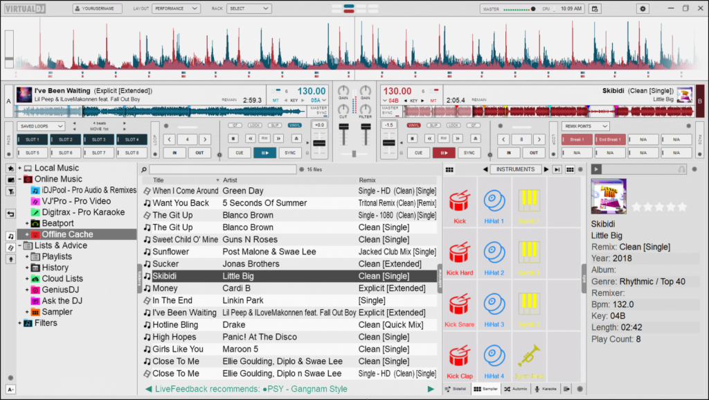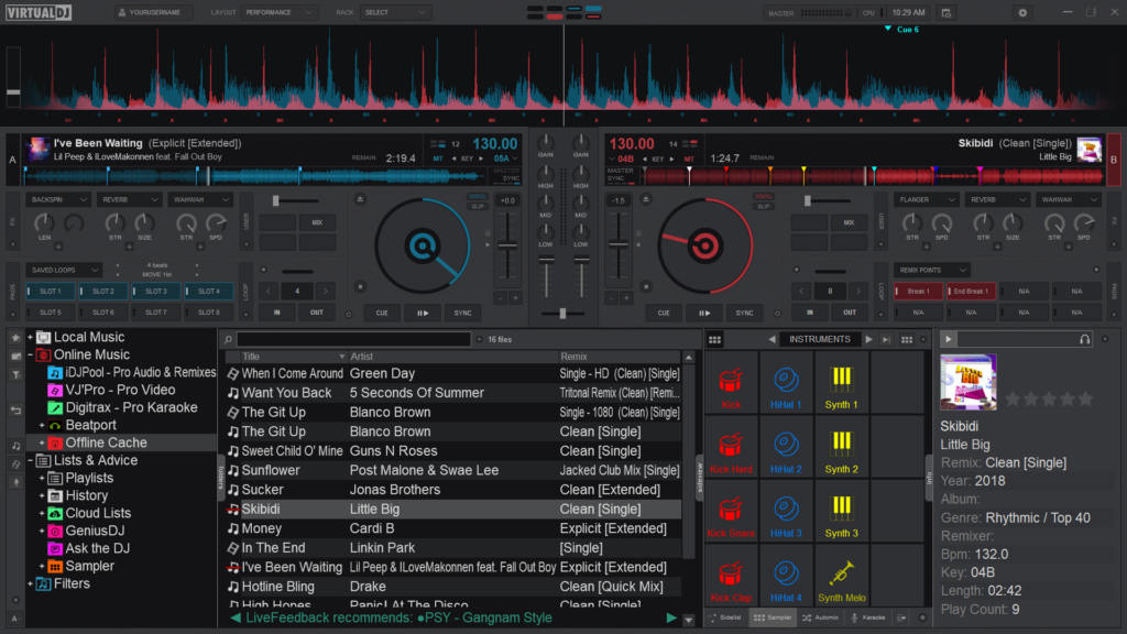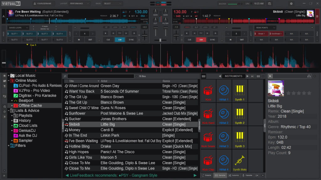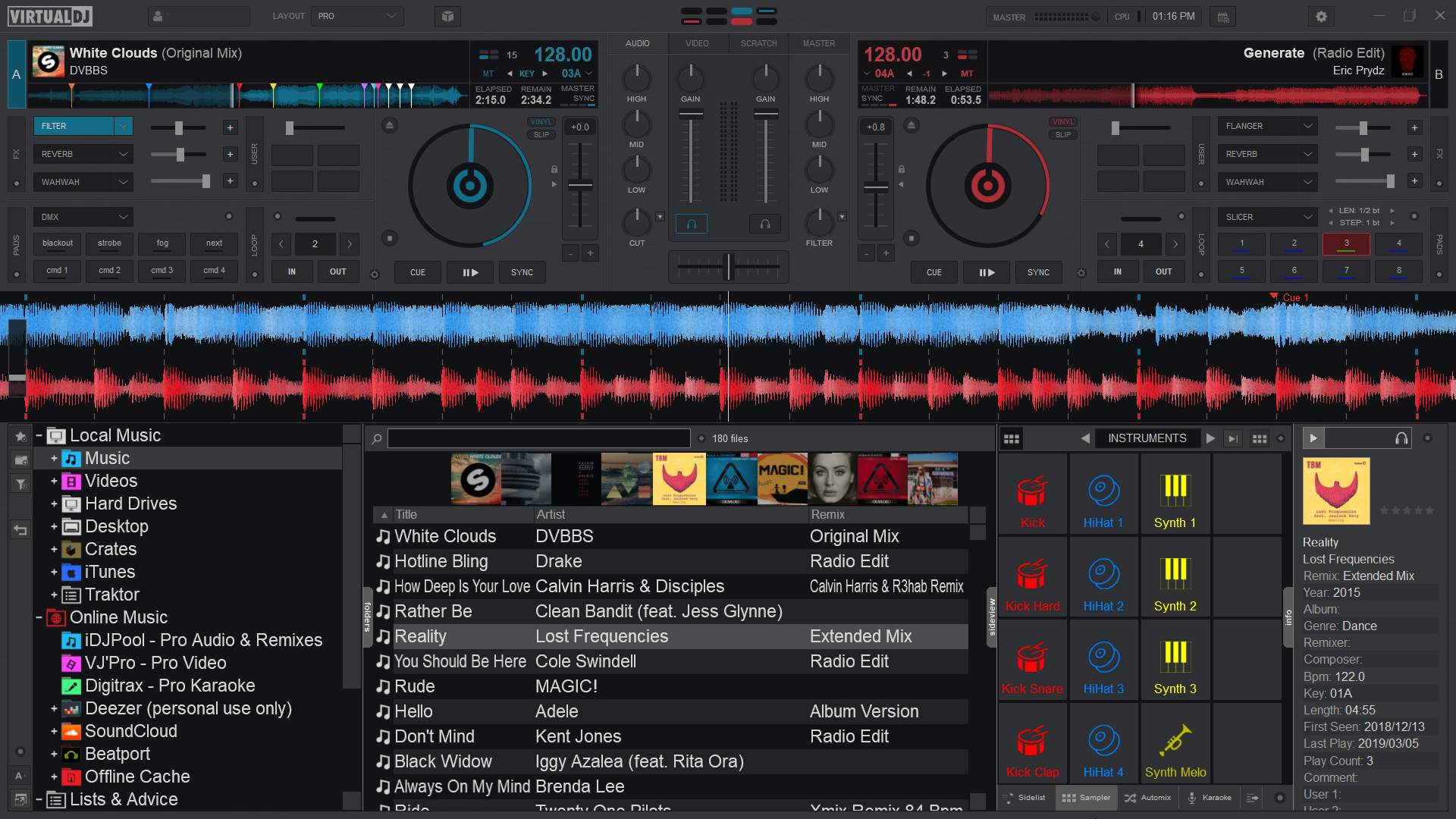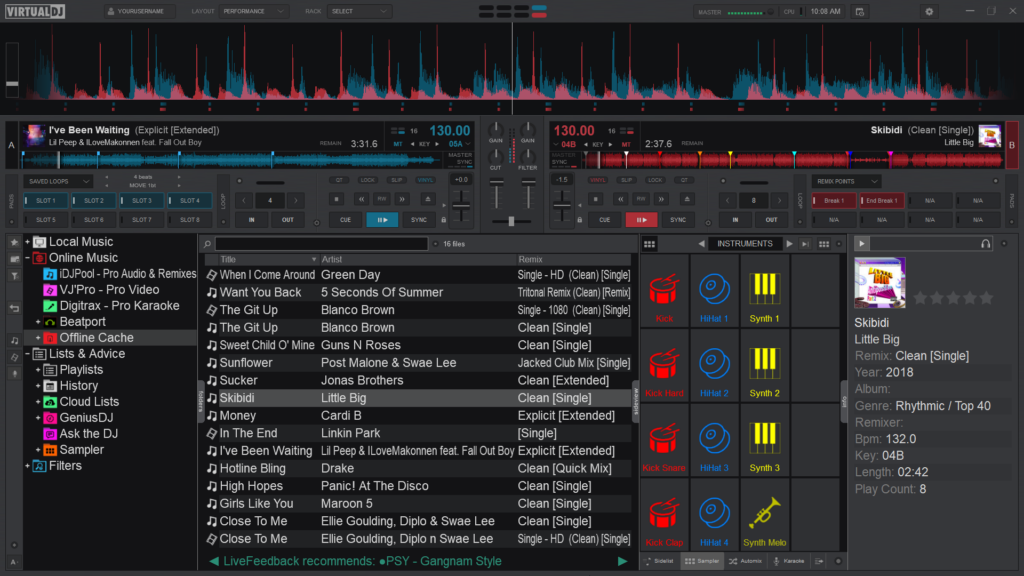 Once selected additional display options are available. The default display is 4-Deck with a 2+2 Channel Mixer but can be changed to a full 4-Channel Mixer.