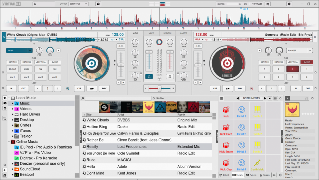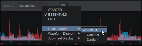 The Layout menu provides the ability to change the overall look and feel of the Graphical User Interface (GUI). Depending on the Skin Layout that is chosen, other options become available to further customize the details of different areas such as the waveform and jog wheels. The Starter Layout has no customization ability, while Essentials and Pro Layouts have different Layout Options.