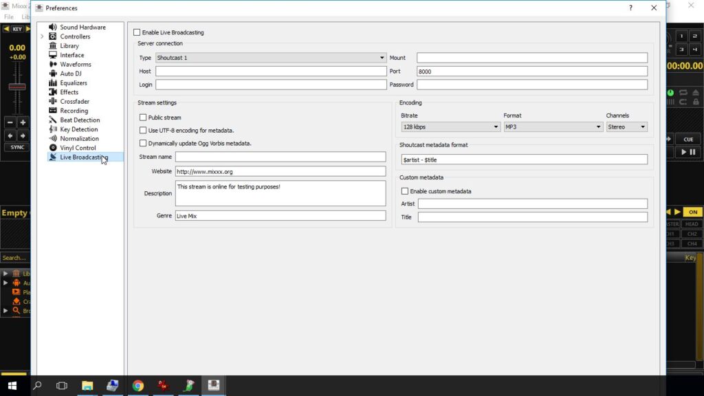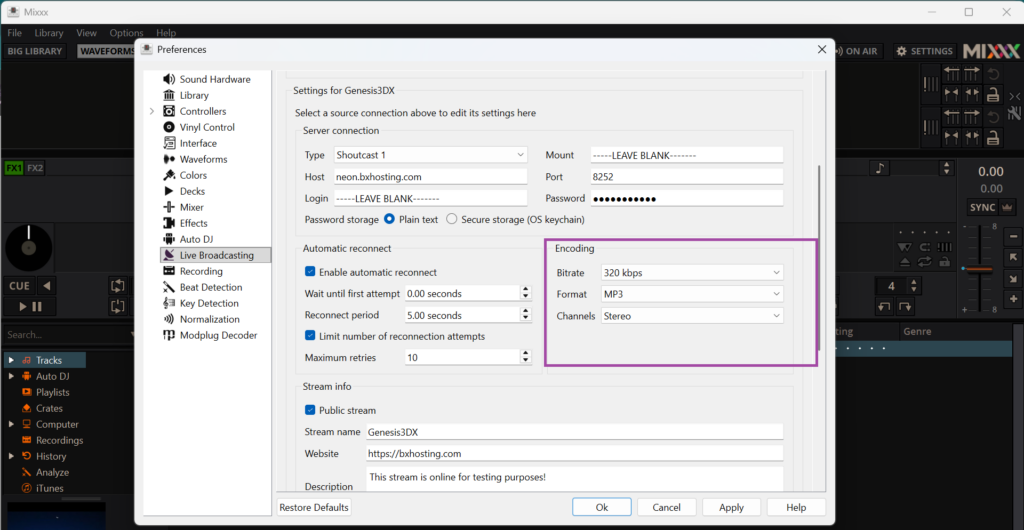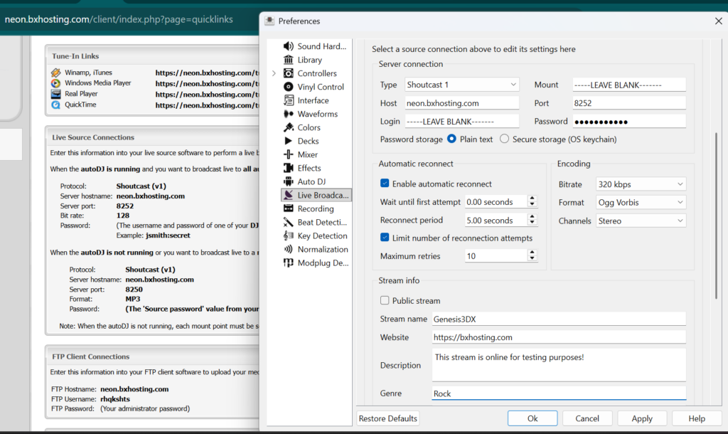 Showing how to set up Mixxx with Centova Cast and bxhosting,com