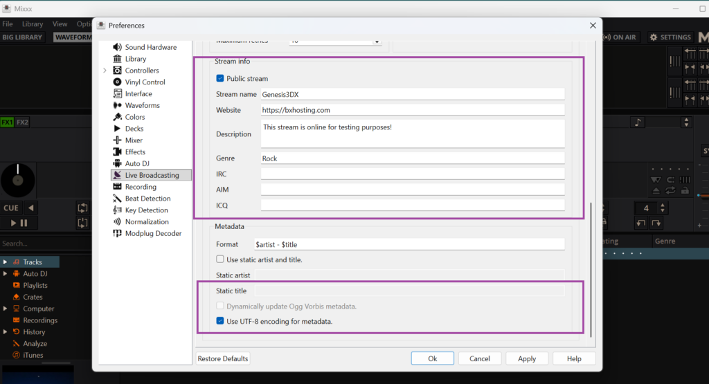 6. Fill in Stream details, it is up to you what details will you use. These are Stream Details that will be seen by your listeners. We also recommend selecting the Public server option and UTF-8 encoding for metadata.