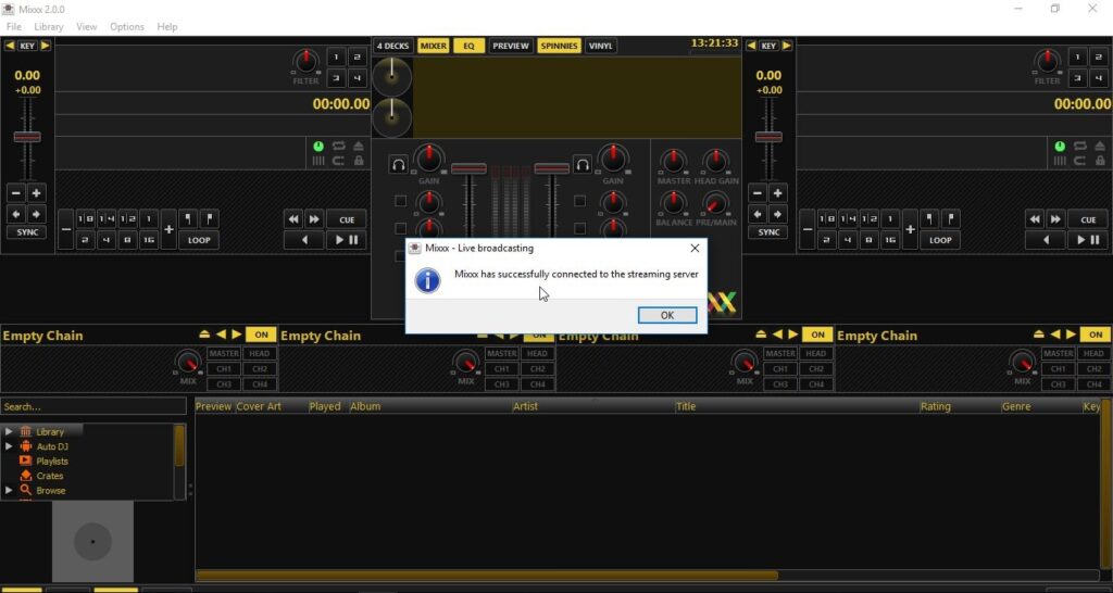 You should see a confirmation that Mixxx has been successfully connected to the server: