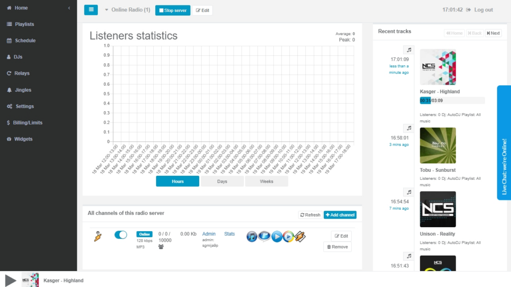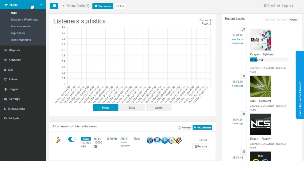 1. The Main Page of the Dashboard contains a menu to the left, buttons that let you Stop and Start the server or Edit the name, lookup recent Listeners statistics, Recently played, queued tracks and access Channel/s Management.