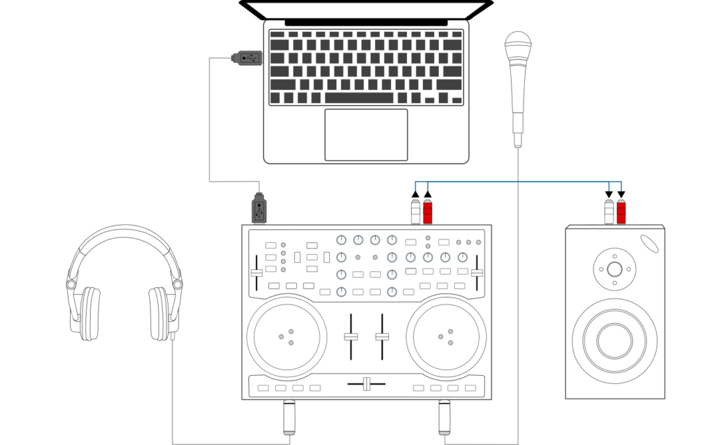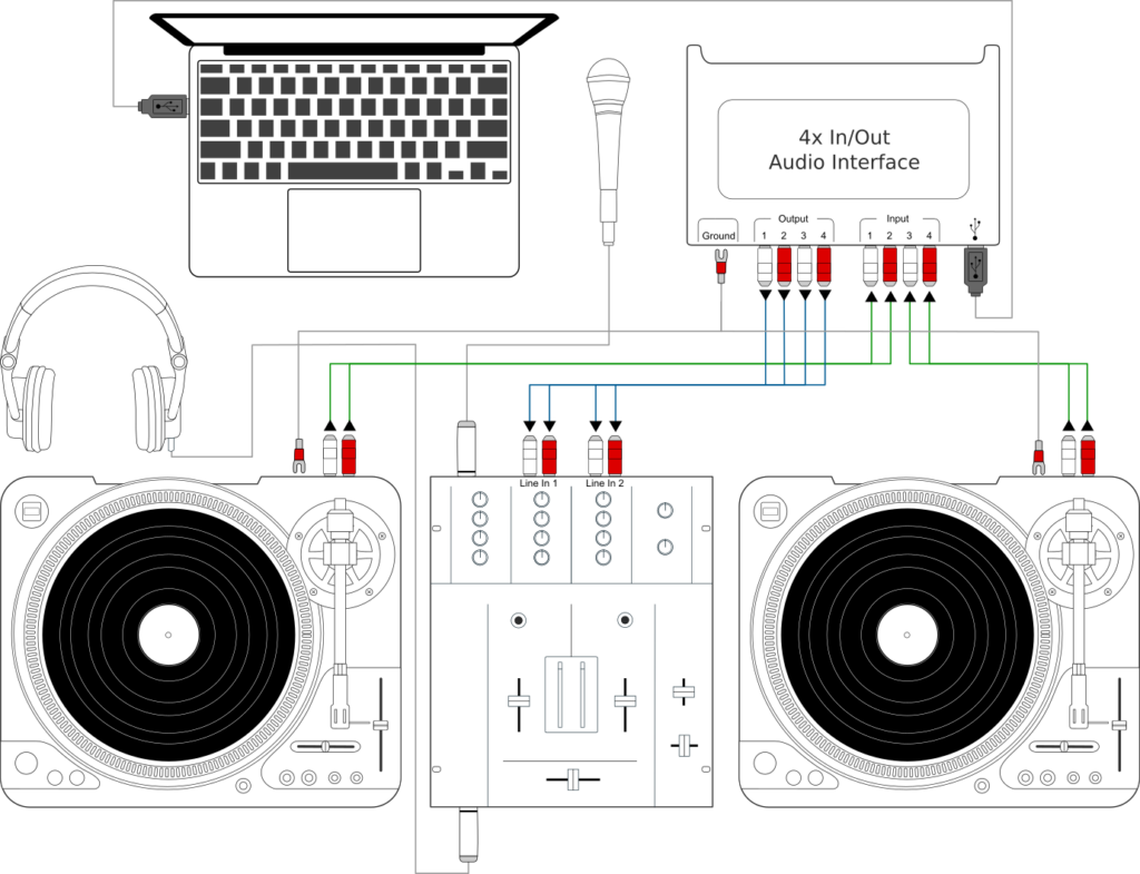 In this kind of setup, Mixxx plays multiple audio files on the computer at the same time and sends each track to a separate audio interface output. The audio interface’s outputs are plugged into an external hardware mixer. The hardware mixer performs the actual mixing of the audio signals. On the hardware mixer, there are separate outputs for the mixed signal to play to the audience and for the DJ to use headphone cueing. External mixing is typically used with turntables and special vinyl records to manipulate digital music files as if the music was on the vinyl records.